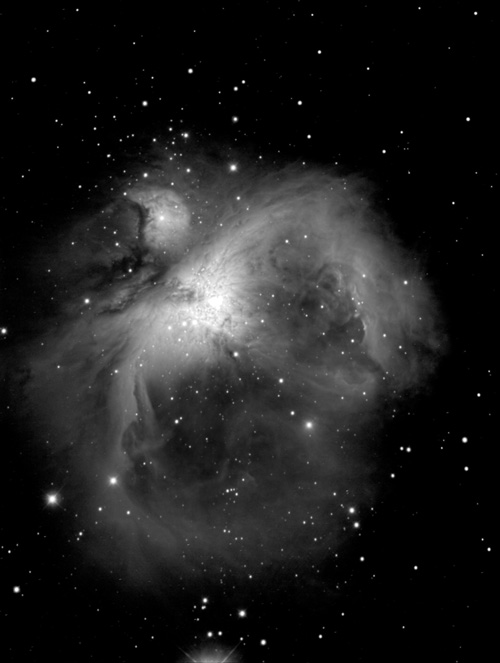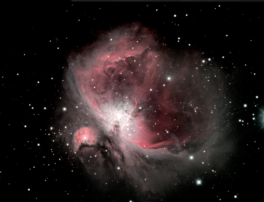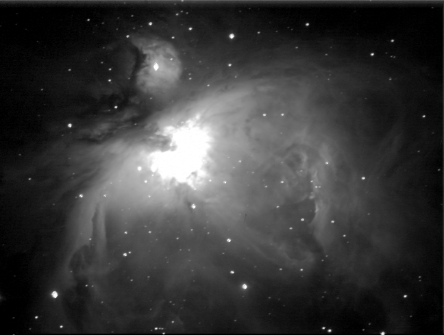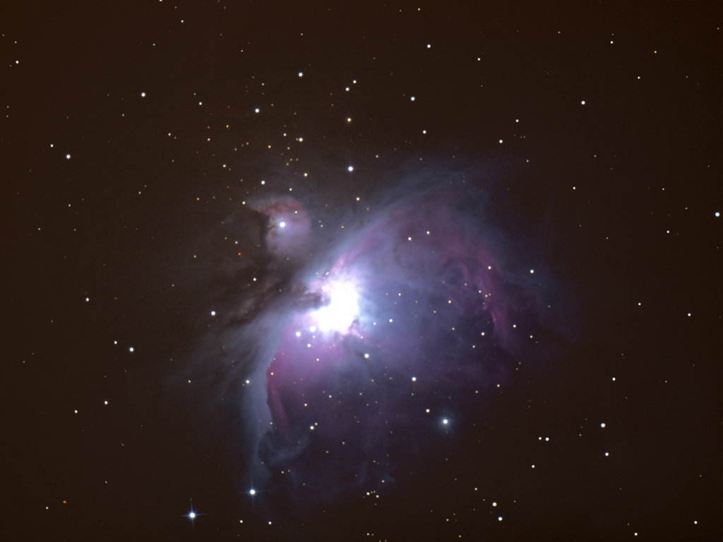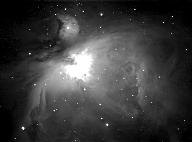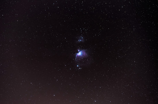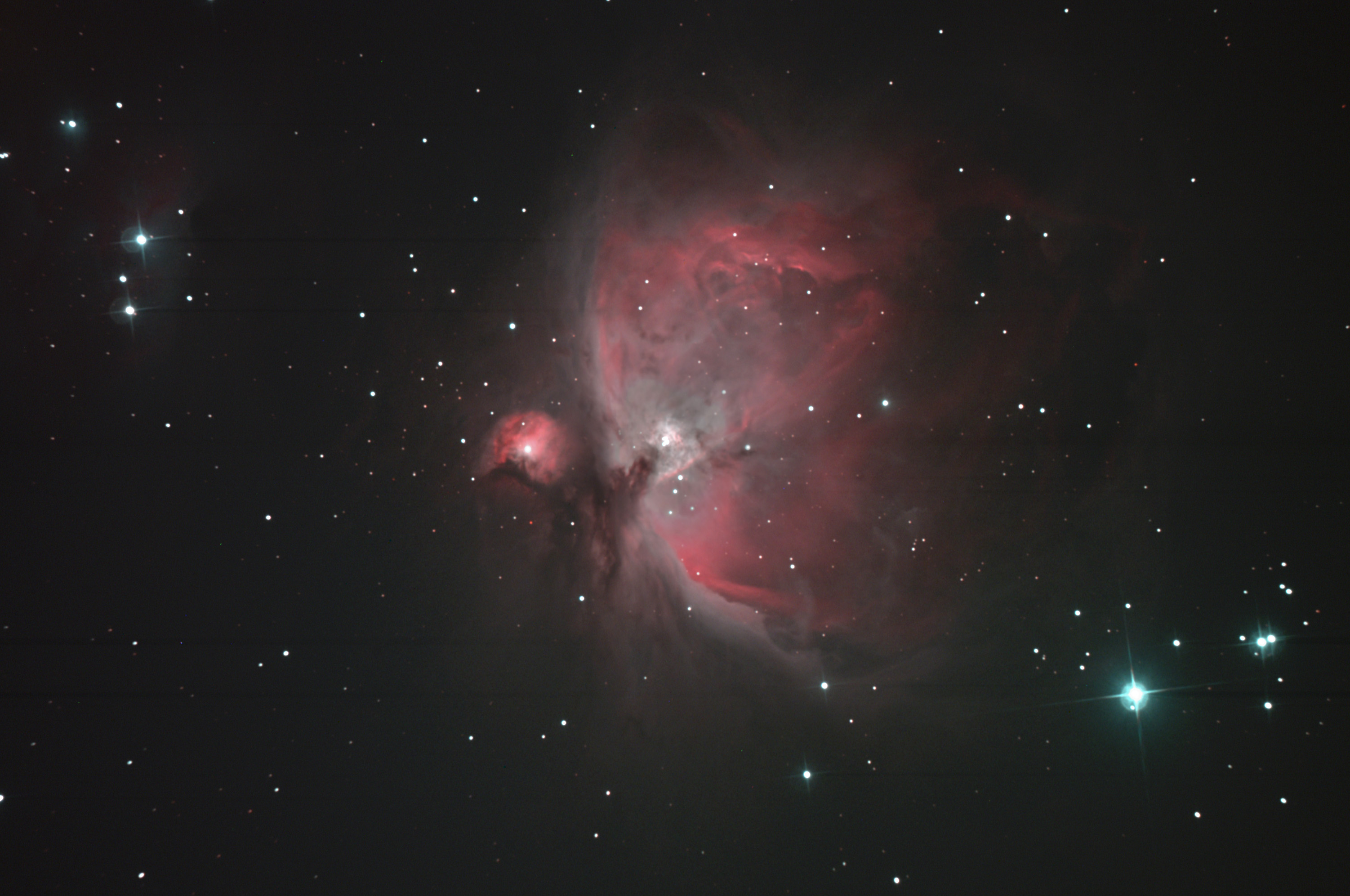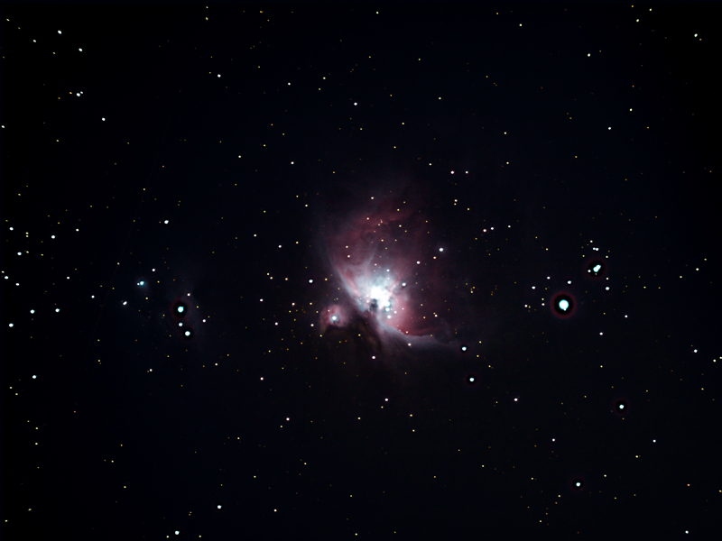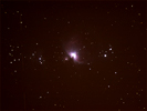 | Der Orionnebel ist ein Emissionsnebel im Sternbild Orion. Dank seiner scheinbaren Helligkeit von 4,0 mag und seiner größe ist er mit bloßem Auge als Teil des Schwertes des Orion sichtbar. Er ist ca.1350 Lj entfernt und hat einen Durchmesser von 30 Lj. | |